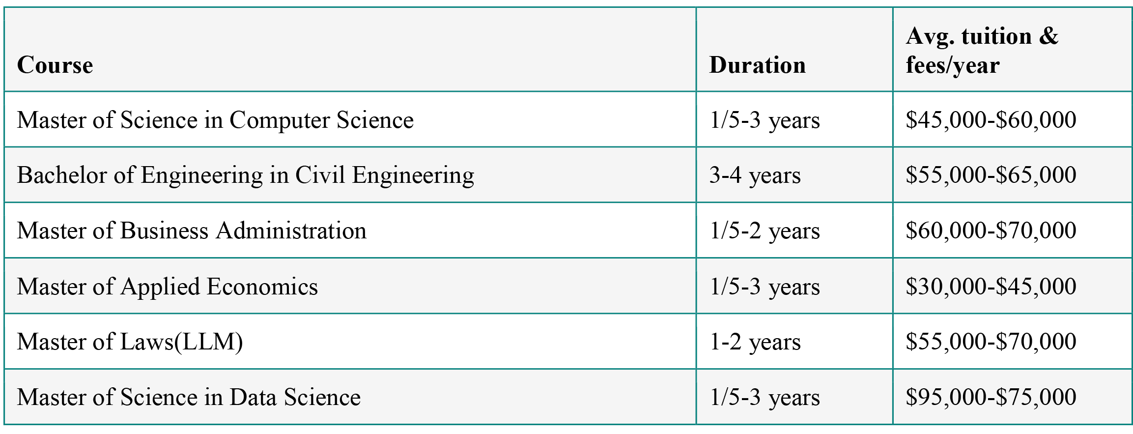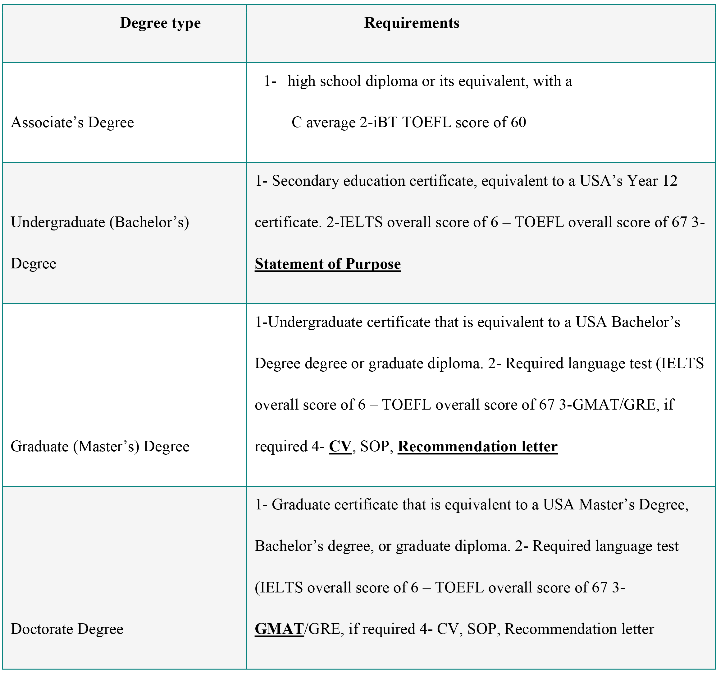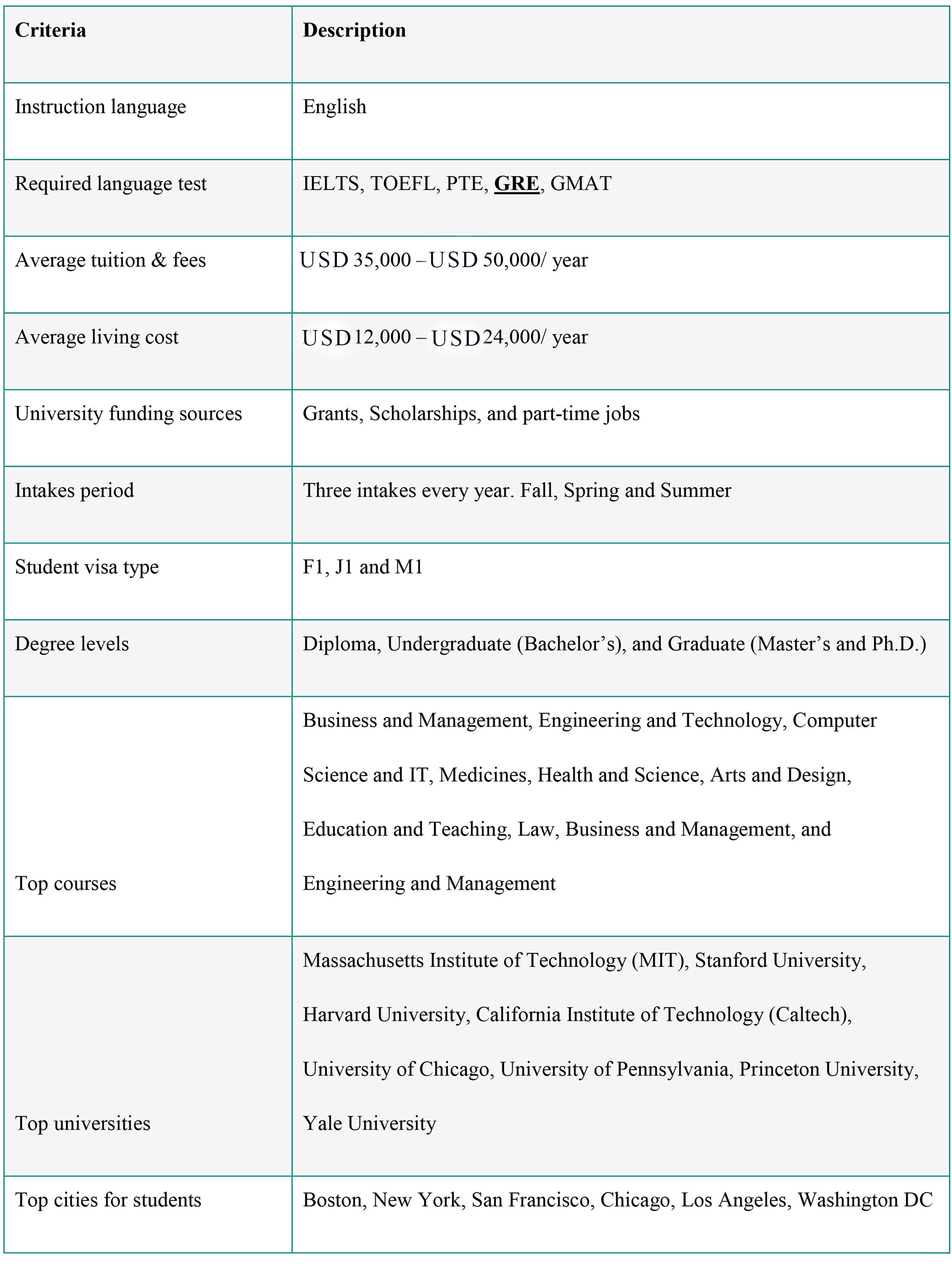 International students must know the admission standards for various courses in the USA shown in the below table: