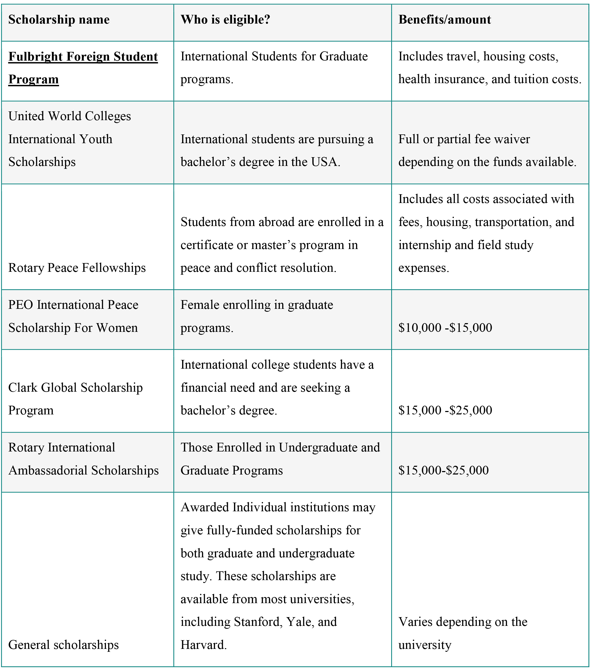 Students can apply for a variety of scholarships and aids to study in the USA, which can keep them focused on their studies. Below are a few of the top scholarships available to Indian and other international students in the USA: