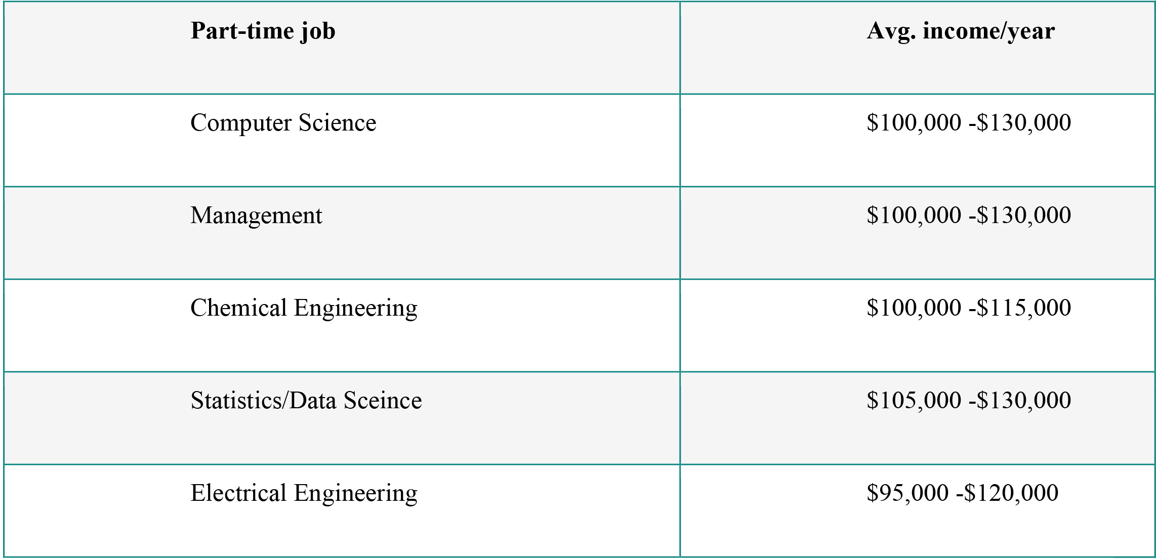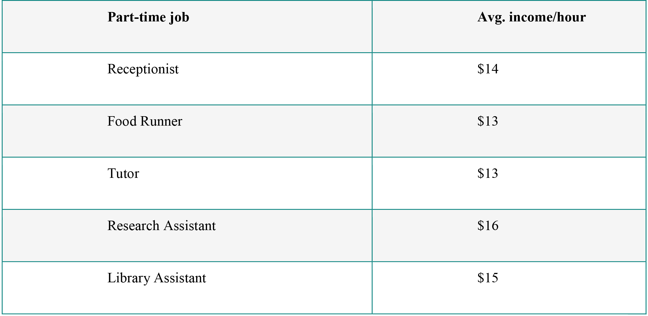 Some well-liked part-time positions for students in the USA are shown in the below table: